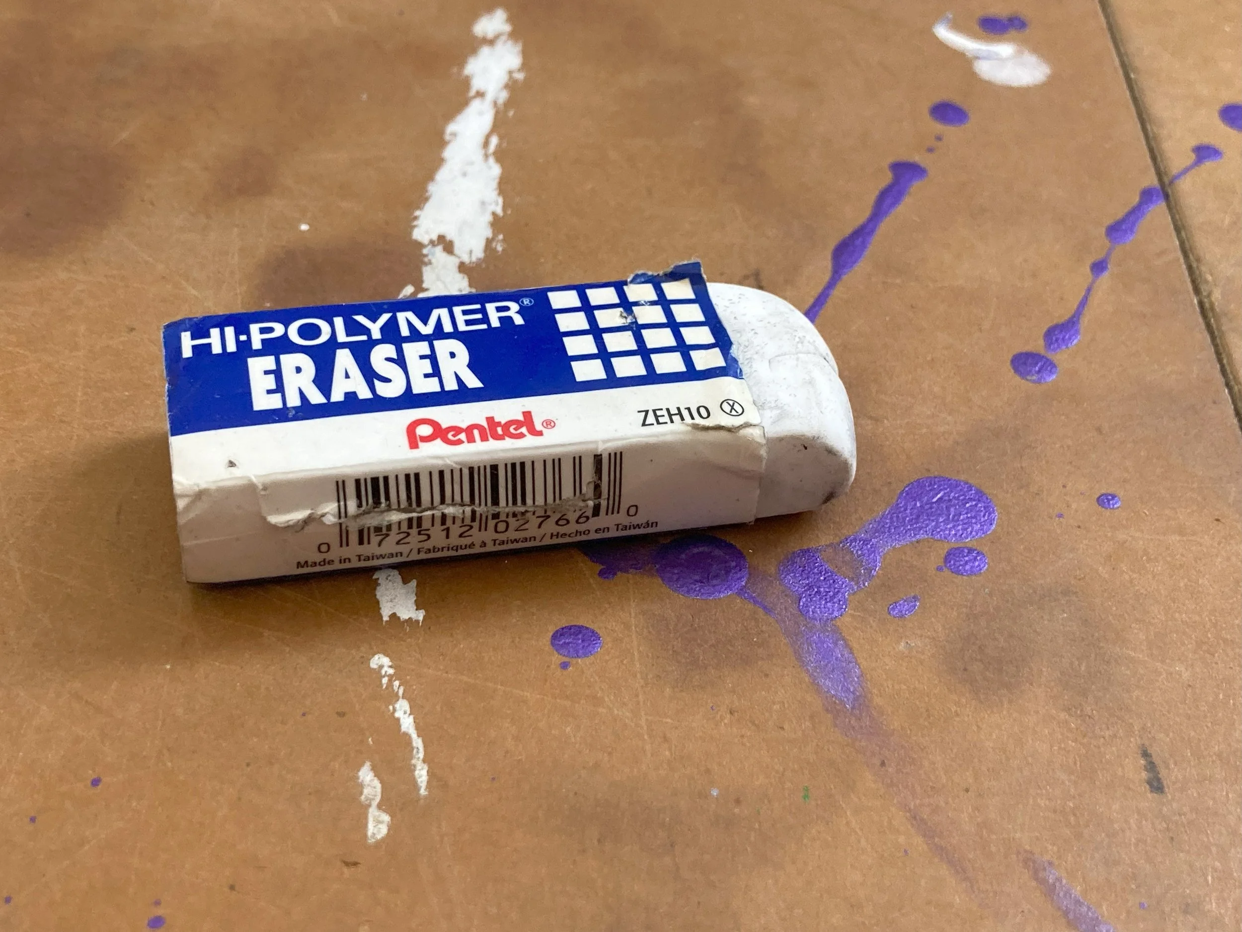 These have been the best erasers available since I was a kid. super classic. aka the type of eraser found on the end of pencils! :) The best part about them is that they're cheap. The texture is much firmer than gum, but softer than vinyl. This eraser is normally used with graphite, but it does work great erasing water based airbrush paints from prepared canvas. Its rubber shavings leave a mess, deal with it! Its a classic! Shop for a Pack of pink pearl erasers here, they’re a must have in the studio.