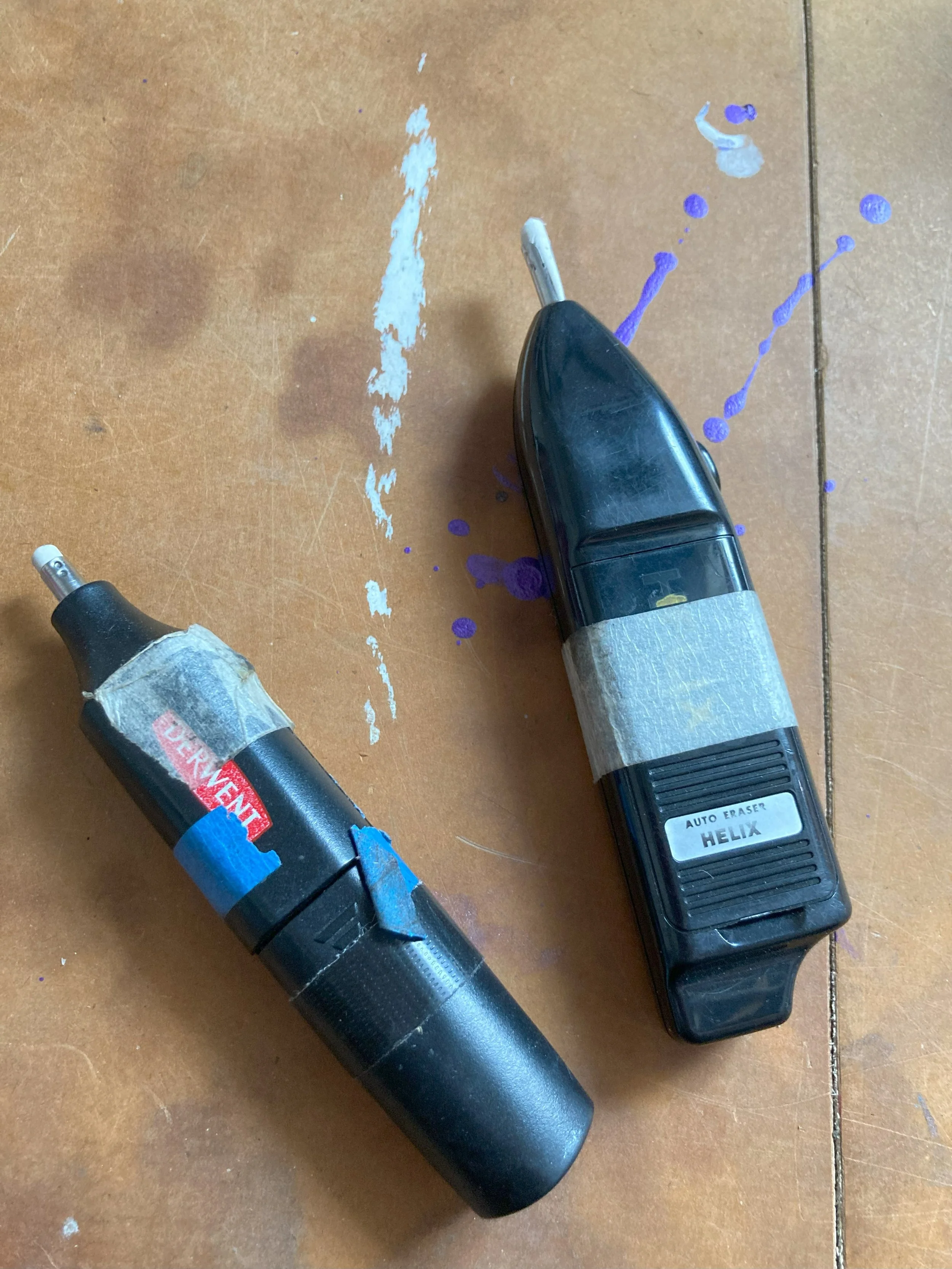 Auto erasers give you so much power to manipulate your paintings. great for creating hot spots or reflections in eyes. erase super fine details, hair strands both gently and aggressively. Ive used both a derwent and helix auto erasers for a long time. why two? Two different eraser sizes, a thicker and a thinner one. Thats why these new electric erasers are game changers, with swappable eraser inserts for two different sizes in one and RECHARGEBLE! full power each session.